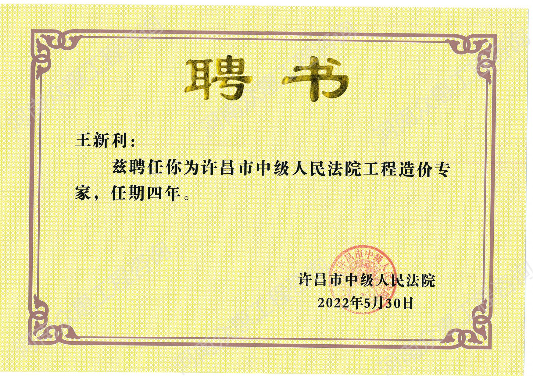 王新利造价专家聘书